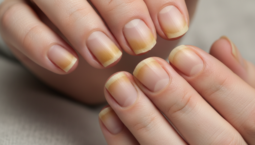 Yellowing is often the first visible sign that something is off. One nail may start to develop a light tint that gradually becomes deeper or more noticeable.